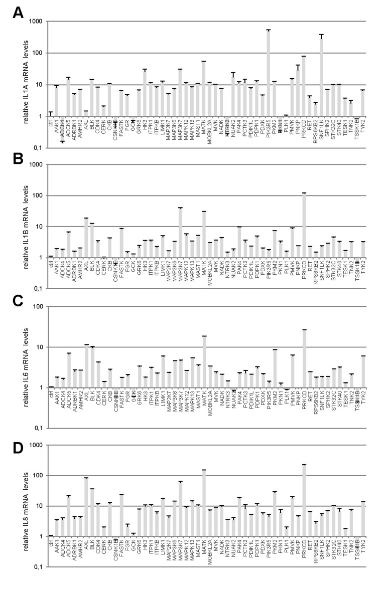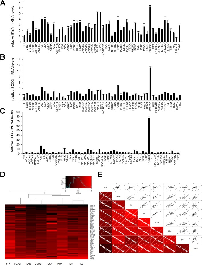 Little is known about the ability of activated kinases other than those acting upstream or downstream from RAS signaling to induce premature senescence. To identify novel cell-senescence-inducing kinases, we stably transduced each kinase gene of a previously described and validated library [7] into normal human fibroblasts (Supplementary Table 1). A first selection on the basis of decreased cell proliferation yielded 53 kinases (Supplementary Table 2). We next examined the effects of these 53 kinases on the levels of transcripts of four well-described SASP components: IL1A (Fig. 1A), IL1B (Fig. 1B), IL6 (Fig. 1C), and IL8 (Fig. 1D) [8,9]. Most of the tested kinases proved able to induce expression of the SASP-component genes, sometimes very strongly (in some cases, more than 100-fold induction was observed) (Fig. 1A-D). Generally, variations in the level of one transcript correlated with changes in the levels of the other three. In others words, the more strongly a kinase induced expression of a SASP-component gene, the more strongly it induced expression of the others (Fig. 1E-F). We found 44 kinases to both decrease cell proliferation and induce expression of SASP-component genes (Supplementary Table 3).