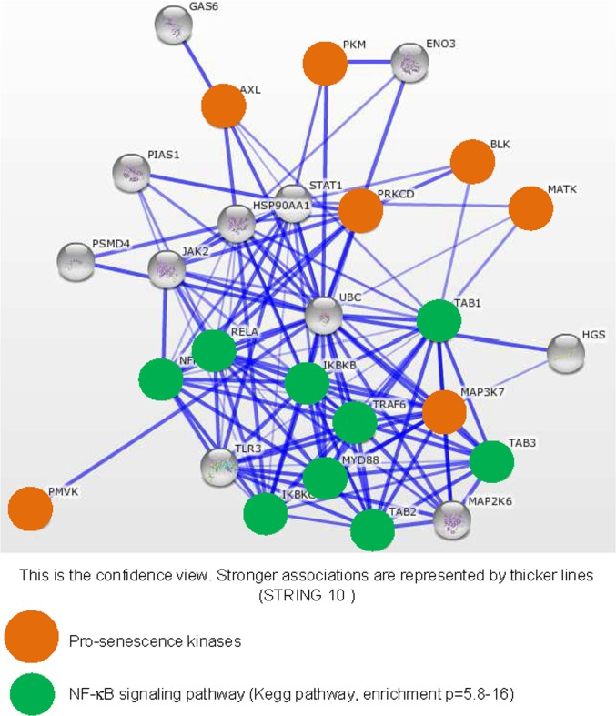 A functional approach on the strongest pro-senescent kinases demonstrates that they all share a common network with NF-κB transcriptional factors and this has been functionally confirmed as NF-κB inhibition is sufficient to block SASP components induction by these kinases. NF-κB is also regulating other intracellular targets showing that senescent cells display a broad chronic NF-κB activation beyond the sole SASP components induction. Focusing on two other pro-senesence pathways, the p53 and p16/Rb pathways, we further demonstrate that inactivation of either one is insufficient to prevent the senescence induced by the identified kinases in normal human fibroblasts. Nevertheless, combined inhibition of p53 and NF-κB is sufficient to reverse senescence by some but not all the pro-senescence kinases tested, suggesting common and distinct pro-senescence pathways induced by the tested kinases.