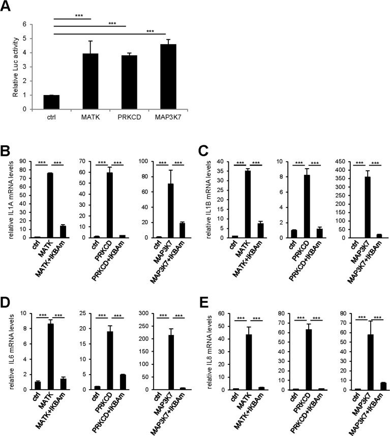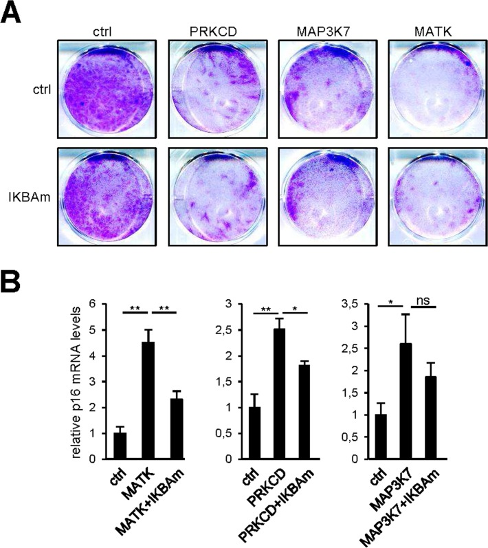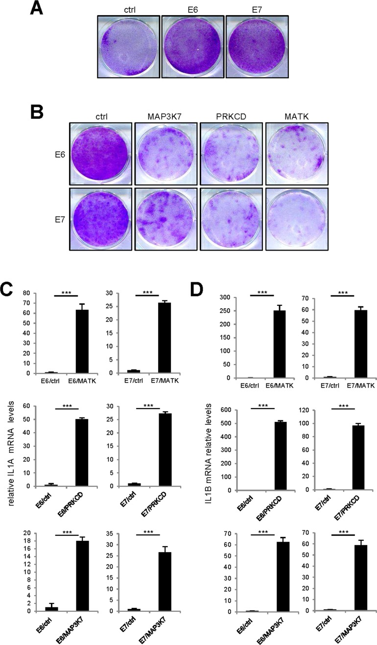 As the p53 and p16/Rb pathways are important mediators of cell senescence [18,19], we wondered whether they might mediate the cell proliferation arrest and upregulation of SASP-component expression observed in response to pro-senescence kinases. We thus used protein E6 to inhibit the P53 pathway and protein E7 to inhibit the p16/Rb pathway. The ability of E6 or E7 to strongly inhibit its target pathway was demonstrated by acceleration of cell proliferation in normal human fibroblasts infected with an E6- or E7-encoding vector, as compared to cells infected with a control vector (Fig. 7A). Yet even in the presence of E6 or E7, constitutive expression of the MAP3K7, PRKCD, or MATK kinases was still found to promote cell proliferation arrest (Fig. 7B) and increased IL1A, IL1B, IL6, and IL8 transcript levels (Fig. 7C-F). Combination of p53 and NF-kB inhibition has been showed to prevent senescence induced by an oncogenic RAS [12]. We then tested whether MAP3K7-, PRKCD-, or MATK-induced senescence might be overcome by inhibition of p53 by E6 and NF-κB by IKBAm. Inhibition of p53 and NF-κB largely reverted senescence induced by MAP3K7 or PRKCD but had no effect on senescence induced by MATK (Supplemental Figure).