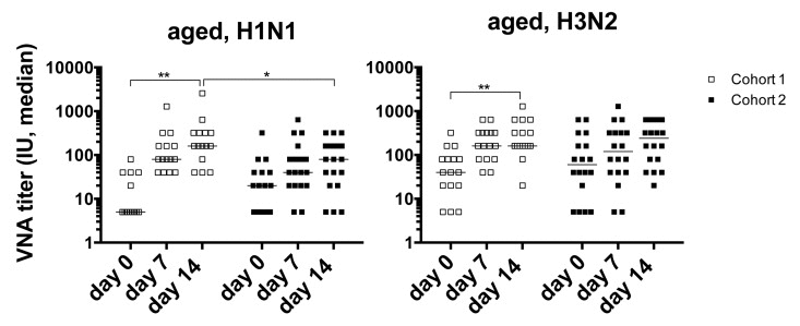 Sera from all vaccine recipients were tested for virus neutralizing antibodies (VNAs) to the two influenza A virus strains of the vaccine, i.e., H1N1 A/California/7/2009 pdm09-like (H1N1) virus and H3N2 A/Victoria/361/2011 (H3N2) virus before vaccination (day 0) and on days 7 and 14 after the 2012/13 vaccination. Individuals were defined as responsive to a vaccine virus if the VNA titers increased by at least 4 fold over pre-vaccination levels and reached titers of, or above, 1:40 on either day 7 or 14 after vaccination (Figure 1). Unexpectedly, response rates of aged individuals of cohort 1 were higher compared to those of individuals in cohort 2. In cohort 1, 93 and 87% responded to H1N1 and H3N2 virus respectively, while in cohort 2, 63% and 53% responded to H1N1 or H3N2. The latter response rate is closer to what would be expected of an aged population. In addition, only cohort 1 showed significant increases in titers to H1N1 and H3N2 virus after vaccination. Comparisons of the 2 cohorts showed that cohort 1 had significantly higher post-vaccination titers to H1N1 (d7 p = 0.04, d14 p = 0.01) and significantly higher post-vaccination increases in titers for H1N1 (d7, d14, p = 0.02) and for H3N2 (d7, p = 0.002). In addition there was a significant inverse correlation in the time interval between the two vaccine doses and absolute post-vaccination antibody titers to H1N1 (d7 p = 0.05, d14 p = 0.02) and titer increases after vaccination for H1N1 (d7 p = 0.01, d14 p = 0.004) and H3N2 (d7 p = 0.008).