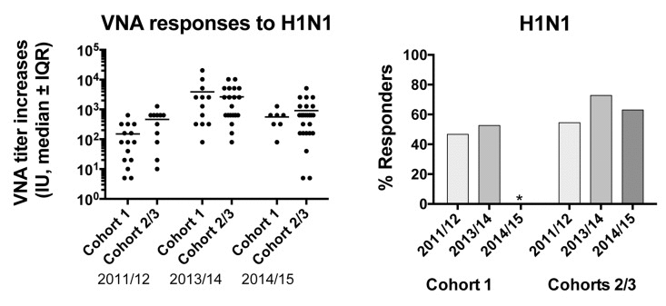 To ensure that the increased response of cohort 1 was not biased by small numbers of cohort 2 or by other intrinsic differences that allowed cohort 1 to mount better than average responses we tested additional samples collected in the 2011/12, 2013/14 and 2014/15 seasons from individuals of cohort 1 as well of from individuals of cohort 2 and others that enrolled into the study (cohort 3). We compared VNA titer increases to H1N1 at day 14 after TIV over baseline of cohort 1 to those of cohorts 2 and 3, data for the two latter cohorts were combined. In addition we assessed responsiveness by determining the percentage of individuals that mounted a response to H1N1 using the above-described criteria. In 2014/15 too few individuals of cohort 1 enrolled to conduct this comparison. VNA titers of cohort 1 in all other seasons such as 2011/12 and 2013/14 when they were vaccinated on the regular time schedule were indistinguishable from those of other aged individuals. Responsiveness, which on average over the 4 year period was at 59% (excluding cohort 1 2012/13 samples) tended to be lower in the other seasons in cohort 1 than in individuals of the other cohorts. This argues against increased responses of cohort 1 upon a shortened vaccination interval due to some fundamental characteristics that allowed this group of individuals to mount superior antibody responses (Figure 2). In neither cohort, responsiveness in one year was predictive of responsiveness to subsequent vaccinations.