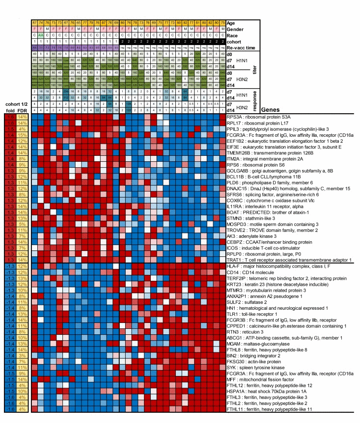 To further understand the basis for the vaccine response differences between cohorts 1 and 2 in the 2012/13 season, we performed gene expression arrays on whole blood collected prior to vaccination on day 0 and compared gene expression profiles between cohorts 1 and 2. We identified a significant differential expression of 786 genes (FDR<15%). A heat map for expression of the top 25 most increased and decreased genes in subjects of cohorts 1 and 2 is shown in Figure 3. A full list of differentially expressed genes is shown in Suppl. Table 1. Several of the transcripts that were increased in cohort 1 are involved in translation (RPL3, RPL10A, RPL38, SFRS6), protein processing and secretion (PPIL3, ITM2A, GOLGA88, SRP72, USP24), metabolism (SC5DL, DENNDAC, ADM2, ATP5H, FAM54A) or lymphocyte stimulation (CD28, ICOS). Genes that were more highly expressed in aged individuals from cohort 2, encode proteins involved in lymphocyte adhesion, mobility and migration (DIP2A, TSPA14, AHAP13, P704P. ILK, LSP1, BIN2), Ca+ flux (ORAI2, ORAI3) and innate immunity (RNF135, MARCO).
