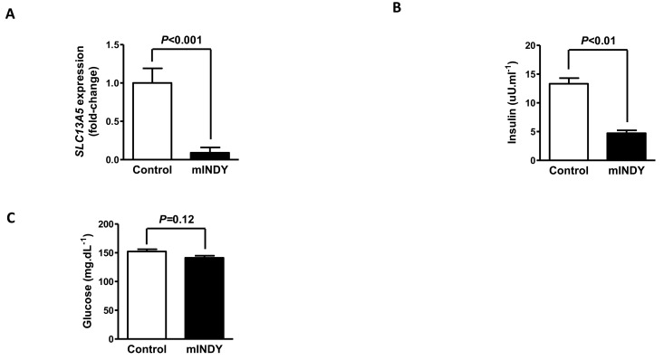 Reducing the expression of the Indy (I'm Not Dead Yet) gene in lower organisms extends life span by mechanism resembling caloric restriction [1–3]. In D. melanogaster, mutating the Indy gene reduces body fat content, insulin-like proteins and reactive oxygen species production, extending life span [1, 4]. Interestingly, Indy mRNA is down-regulated by dietary restriction in normal flies and it was shown that Indy long-lived flies share several phenotypes with long-lived calorie restricted flies [2]. Similarly, in C.elegans, knock down of the Indy homolog CeNAC2 extends life span [5], an effect mediated at least in part via AMPK/aak2 [6]. The mammalian Indy homolog encoded protein mINDY (NaCT) is part of the SLC13 protein family, consisting of Na-carboxylate and Na-sulfate cotransporters in vertebrates, invertebrates, plants, and bacteria [7]. mINDY mediates the co-transport of citrate, succinate, and several other dicarboxylates across the plasma membrane together with sodium in an electrogenic manner [8, 9]. The amino acid sequence of the N-terminal sodium and the carboxy-binding motif is highly conserved between many species, from bacterium to rat to human [10].