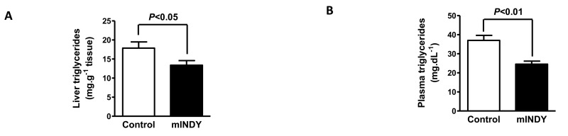 Liver triglycerides in the mIndy ASO treated group were significantly reduced (17.9 ± 1.6 mg.g−1 tissue for control group vs. 13.4 ± 1.2 mg.g−1 tissue for mIndy ASO treated, P=0.04) (Fig. 2A). Consistent with this, we observed a significant 35% reduction of plasma triglycerides in the mIndy ASO treated group compared to the control group (37.0 ± 2.6 mg.dL−1 for control group vs. 24.6 ± 1.6 mg.dL−1 for mIndy ASO treated, P<0.01) (Fig. 2B). Other plasma metabolites were determined by an unbiased metabolomic approach using GC-TOF-MS. Profiles indicated significant changes in specific amino acids and total cholesterol and are listed in Table 1.