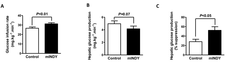To determine the organ specific contribution to the improvement in glucose metabolism, the gold standard hyperinsulinemic-euglycemic clamp (HEC) test with stable isotope tracers was used. The glucose infusion rate during the clamp was significantly higher in mIndy ASO treated rats as compared to the control group (26.6 ± 1.4 mg.kg−1.min−1 for control group vs. 31.2 ± 1.2 mg.kg−1.min−1 for mIndy ASO treated rats, P<0.01) (Fig. 3A), confirming improved insulin sensitivity. The improvement was associated with a trend towards a reduction in basal rates of hepatic glucose production (5.0 ± 0.5 mg.kg−1.min−1 for control group vs. 4.2 ± 0.4 mg.kg−1.min−1 for mIndy ASO treated rats, P=0.07) during the HEC (Fig. 3B). Furthermore, hepatic insulin responsiveness was increased in the mIndy 2′-O-methoxyethyl chimeric ASO rats as reflected by increased suppression of hepatic glucose production during the HEC (28 ± 5% for control group vs. 52 ± 8% for mIndy ASO treated rats, P<0.05) (Fig. 3C).