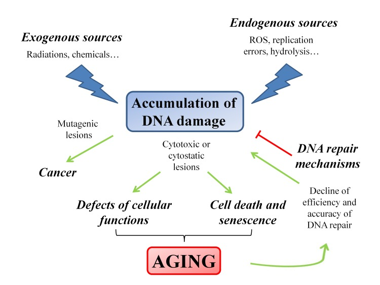Different cellular outcomes can follow DNA injury: if DNA lesions are not properly repaired or are fixed by replication, they are converted into permanent mutations that significantly increase the risk of cancer; alternatively, DNA damage could also cause replication arrest leading to cellular senescence or cell death, thus contributing to the onset of the aging process. Therefore, cancer and aging, both arising as the consequence of irreparable DNA damage, can be considered as the two sides of the same coin [13]. Taking into account these considerations, little doubt remains about the causative role of DNA damage in tumorigenesis as well as in aging [17]. In particular, in aging the increase of DNA damage rate is the overall result of the imbalance between generation and disposal of by-products deriving from cellular metabolism [18], and the functional decline of DNA repair efficiency [19–21] (Figure 1).