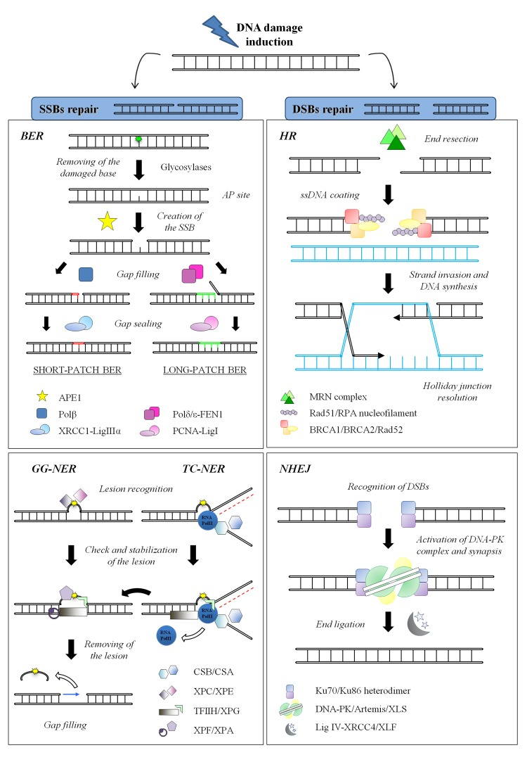 To cope with DNA damage, cells have evolved the DNA Damage Response (DDR), an intricate and finely regulated genomic maintenance apparatus that senses and signals the presence of lesions to finally promote their repair. The DDR includes various checkpoints, signal-transduction cascades and effectors systems that affect important cellular processes, such as replication, transcription, cell cycle progression, chromatin remodeling, differentiation or apoptosis [35–38]. Furthermore, the DDR triggers distinct repair pathways, each specific for a particular class of DNA lesion aimed at restoring the integrity of the chemical structure of DNA molecule [39]. In Figure 2 the main repair mechanisms for Single Strand Breaks (SSBs) and Double Strand Breaks (DSBs) are schematized, including their key components. Taking into account all its properties, this complex network of DNA repair systems each one dedicated to a specific type of damage, is one of the most powerful determinant of the cell's choice among survival, replicative senescence or death [40,41].