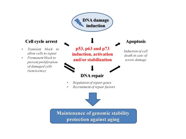 Genomic instability is tightly linked to the aging process. As the integrity of DNA is continuously challenged by endogenous and exogenous factors, the mechanisms that safeguard genome maintenance can be considered to all intents and purposes as anti-aging processes. Among these, the different and specific repair mechanisms that cells have developed to restore the chemical structure of the DNA molecule should be unquestionably included. However, in addition to the core proteins, that are instrumental for the execution of the repair processes, there is an ever growing number of accessory proteins involved in these mechanisms that indirectly help the DNA repair. In particular, transcription factors can support DNA repair by regulating the expression of key factors of the DNA repair machinery. Nevertheless, they can also recruit different chromatin remodeling complexes to the DNA damage sites, thus mediating the accessibility of the DNA that has to be repaired. Furthermore, they are also usually involved in the regulation of the other processes strictly linked to the repair mechanisms that occur during the DNA damage response. In this context, the p53 family plays multiple important roles in modulating the aging process (Figure 4). Following a DNA damage induction, the members of this family are induced or stabilized, usually through post-translational modifications of the proteins. In their active form, they can exert partially overlapped roles in regulating processes that determine the fate of the damaged cells. Depending on the extent of the damage, their role can vary from (i) the induction of a transient cell cycle arrest to allow DNA repair, to (ii) the induction of a permanent blockade of proliferation resulting in senescence, to (iii) the stimulation of apoptosis to eliminate damaged cells. In their quality of transcriptional regulators p53, p63 and p73 can also influence the efficiency of repair mechanisms by regulating the expression of key factors or by directly interacting with them as we saw in the previous paragraphs. In light of these evidences, there is no doubt that the p53 family plays a central role in maintaining the genome stability. As a direct consequence of this, we can conclude that their function strongly impacts on the complex regulation of the aging process.
