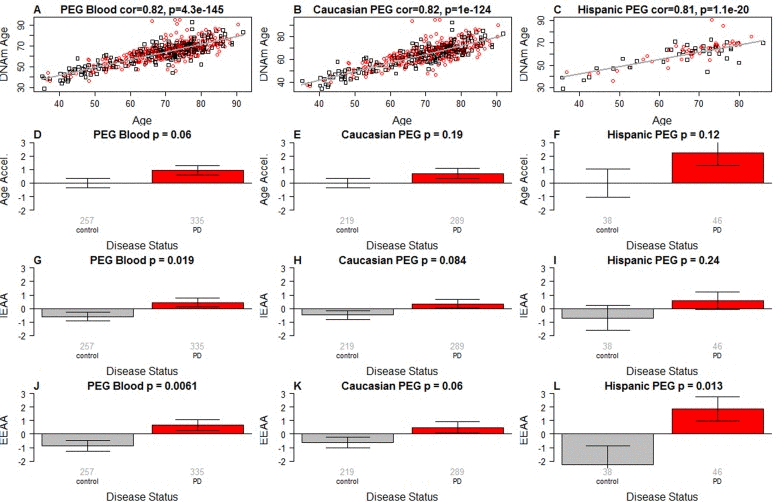 PD status has a (marginally) significant relationship with all 3 measures of age acceleration: p=0.06 for the universal measure of age acceleration (Figure 1A-C), p=0.019 for IEAA (Figure 1G-I), and p=0.0061 for EEAA (Figure 1J-L).