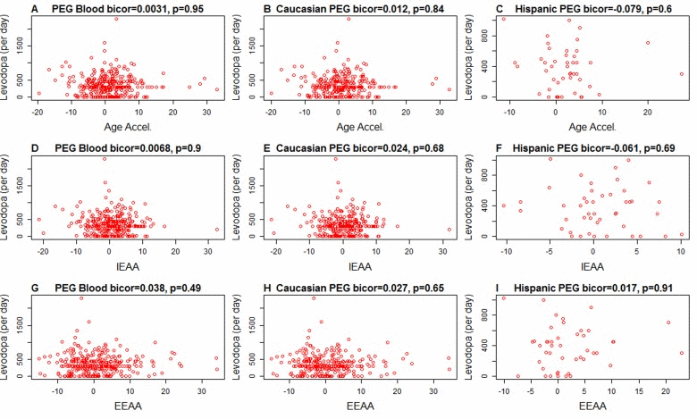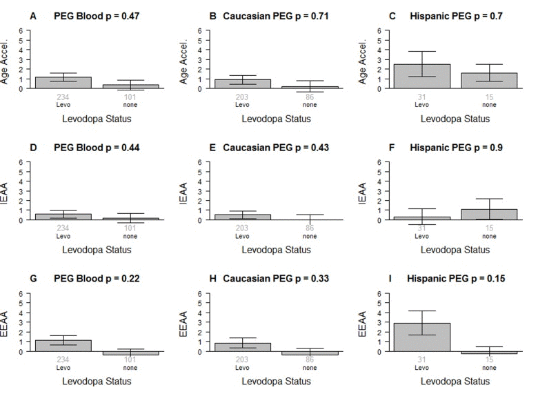 It is unlikely that Levodopa medication explains the increased epigenetic age acceleration since we find no significant association between the amount of Levodopa medication and any of the measures of age acceleration in PD patients (Figure 2). These results were corroborated in a second analysis in which we related medication status (binary grouping variable) to the measures of epigenetic age acceleration in PD patients (Figure 3) and found no associations.