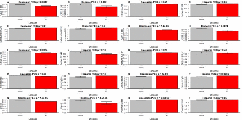 We find striking differences in blood cell composition between PD cases and controls (Figure 4). Compared to control samples, PD patients have more granulocytes (p=1.0×10–9 in Caucasians, p=0.00066 in Hispanics Figure 4O,P) and plasma cells (activated B cells) (p=0.00065 in Caucasians Figure 4S) but fewer helper (CD4+) T cells (p=1.4×10–6 in Caucasians, p=0.0024 in Hispanics, Figure 4G,H), fewer naïve CD4+ T cells (p=0.0074 in Caucasians, p=0.13 in Hispanics Figure 4I,J), fewer B cells (p=1.6×10–5 in Caucasians, p=4.5×10–5 in Hispanics Figure 4Q,R), and fewer cytotoxic (CD8+) T cells (p=0.0017 in Caucasians, p=0.072 in Hispanics Figure 4A,B). A multivariate logistic regression analysis shows that granulocyte count remains a significant predictor of PD status (p=0.027, Table 2) even after adjusting for other covariates. We did not observe significant association between PD status and the amount of naïve CD8+ T cells (Figure 4C,D), exhausted CD8+ T cells (Figure 4E,F), natural killer cells (Figure 4K,L) or monocytes (Figure 4M,N).