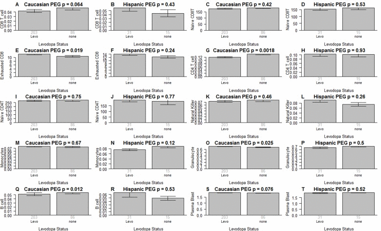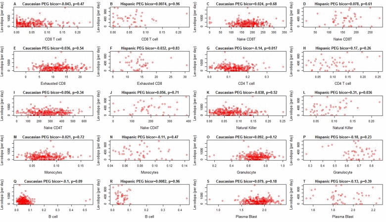 It is unlikely that medications explain the difference in blood cell counts because both medication status and amount of medication have no more than a weak association with blood cell counts in PD subjects (Figure 5): when relating the amount of Levodopa (mg per day) to blood cell counts in PD subjects, we only found a weak marginally significant correlation with CD4+ T cells (r=−0.14, p=0.017 in Caucasians, Figure 5G). We only observed relatively weak associations between Levodopa medication status (binary) and blood cell counts (Figure 6). In Caucasian PD patients, we found that medicated patients have fewer CD4+ T cells (p=0.0018 Figure 6G), granulocytes (p=0.025 Figure 6O), and B cells (p=0.012 Figure 6Q) but more exhausted CD8+ T cells (p=0.019 Figure 6E). In Hispanic PD patients, we could not detect a significant association between medication status and blood cell counts, which might reflect the small number (n=15) of un-medicated PD patients in this group.