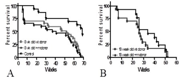 To test the hypothesis that premature aging could be induced in wild-type recipients of +/m bone marrow, we transplanted four-week old lethally irradiated wild-type female C57Bl/6 mice with 2 × 106 BM from 8 week old p53+/m male C57Bl/6 mice and a control group with 8 week old wild-type male bone marrow (n=20/group). An unirradiated, untransplanted control group was also included (n=12). Long-term survival was not significantly different between both transplanted groups (lower curves Figure 1A); mean time to death was 46.6+/−12.9 weeks in the group that received wild-type BM vs. 43.6+/−14.7 weeks in the group that received p53+/m BM (p=NS). For both groups, maximum survival was approximately 70 weeks (p=NS). Although overall growth was also similar, recipients of +/m BM achieved maximal weight approximately five weeks sooner that wild type (43.8 weeks +/m vs. 47.2 weeks wild type, p<0.0001), suggesting that the recipients of the +/m BM may be reaching “middle age” before the recipients of wild-type BM. In a second experiment, we investigated the effect of transplanting mature BMDSCs on long-term survival. Four-week old lethally irradiated female C57Bl/6 recipients received BM from 18-week old wild-type C57Bl/6 (n=17 recipients) or +/m (n=13 recipients) male donors. No statistically significant differences in long-term survival were detected between the recipients of wild-type or +m BM (Figure 1B).