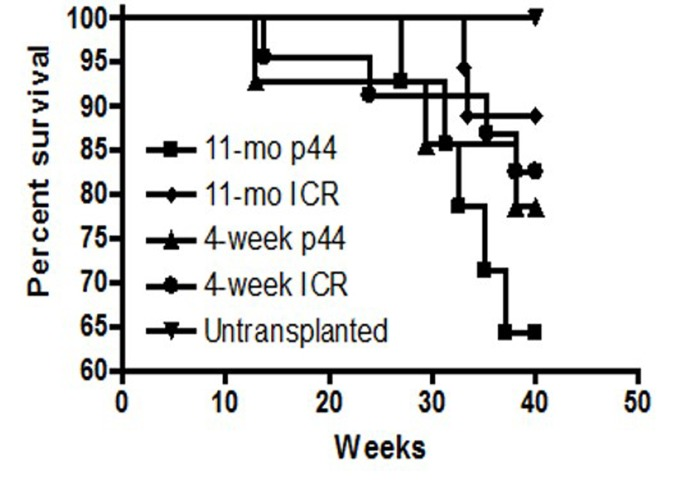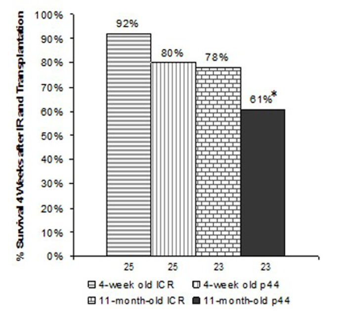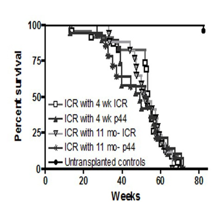 Bone marrow derived stem cells (BMDSCs) were initially studied for their role in hematopoiesis but in the last 15–20 years the role of these stem cells in regeneration and repair of other tissues and in aging has been an active area of research. In the 1950′s it was found that lethally irradiated recipients could be rescued by transplantation of spleen or bone marrow (BM) cells [1–3]. In the 1970′s, Harrison et al. demonstrated through serial BM transplantation experiments that murine BMDSCs could survive and produce progeny in the recipients for more than 8 years [4, 5]. The widely expressed protein p53 is a critical participant in tumor suppression and more than 50% of human cancers contain mutations in p53. Though the functions of this protein in cancer have been extensively studied, recent work suggests a role for p53 in prolonging life [6–8]. To test the hypothesis that BMDSCs contribute to the stem cell population of other organs and in this way restore tissue stem cells and delay organismal aging, we studied the effect of bone marrow transplantation using young and old donors and p53-based early aging mouse models. We theorized that if BMDSCs play a role in the aging process, then transplantation of BM from early aging donors into lethally irradiated wild-type recipients should induce premature aging, and conversely, transplantation of bone marrow (BM) from young wild-type donors should extend the lifespan of recipients with early aging phenotypes. Unexpectedly, in these studies, control groups of C57BL/6 mice receiving young wild-type bone marrow did not survive significantly longer than mice receiving old wild type bone marrow. Due to difficulties with the p53+/m model [6], we switched to the p44 model of Maier et al. [9]. In this study we found that the ICR strain of mice receiving either young or old p44 bone marrow had a significant decrease in both short term survival and in mid-life survival as compared to ICR mice receiving comparable young and old wild-type BM, suggesting a deficit in short term hematopoietic stem cells (ST-HSCs) in p44 mice.