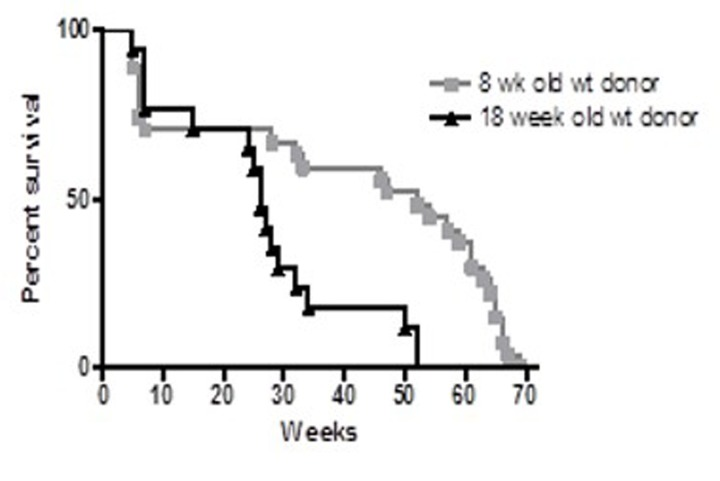 When the control groups from these two experiments were compared, the long-term survival was significantly longer in recipients of the younger (8-week old) BM than in recipients of BM from older (four-month old) donors (p<0.001) (Figure 2). These results suggest BMDSCs from older donors may be defective in their long-term repopulation capacity. To confirm this observation, an additional experiment was performed comparing survival of recipients of young (7 weeks) and old (27 months) bone marrow.