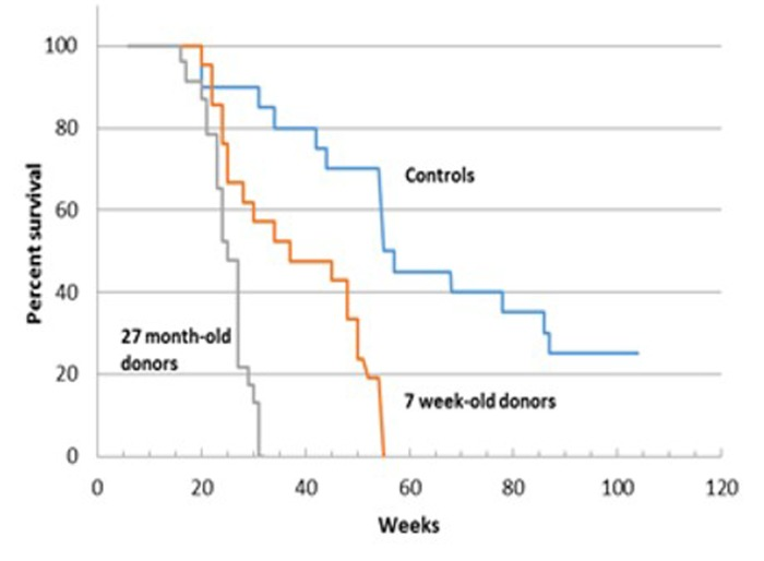 Survival of female C57Bl/6 mice transplanted with bone marrow cells (BMCs) from young (7 weeks) and old (27 months) male C57Bl/6 donors is shown in Figure 3. Originally 27 mice were included in each group. Twenty three mice that received BM from 27 week old donors and 21 recipient mice that received BM from 7 week old donors survived the 4 weeks post transplantation. Untransplanted control survival monitoring began at 6 weeks of age and the experiment was terminated at 104 weeks. Both recipient groups had significantly shorter survival than control un-irradiated groups. From first review of the Kaplan-Meier survival curves, the survival of recipients of 27 month-old BM appeared shorter than that of recipients of 7 week old BM (e.g. maximum lifespan was 28 weeks and 55 weeks, respectively). However, statistical analysis failed to confirm a significant difference between these groups. (See Supplement 1 for statistical analysis.).