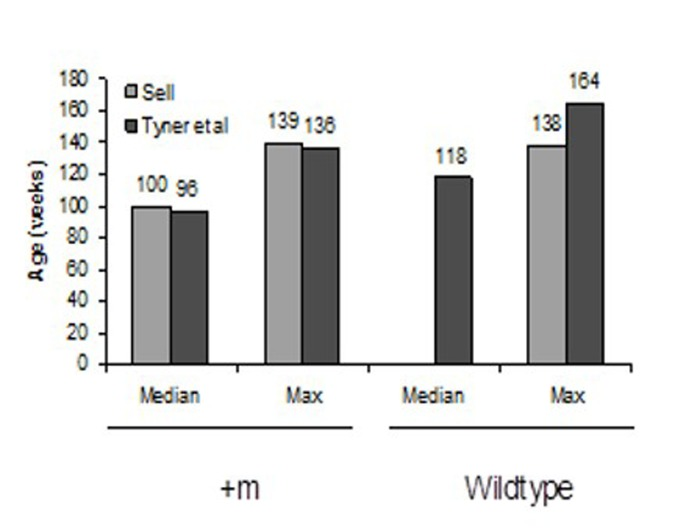 The differences in the weights of our mice and those reported in Tyner et al. are striking, but difficult to explain. In the work published by Tyner et al. [6] the +/m mice had only been backcrossed to C57Bl/6 for 2 generations and were on a C57BL/6–129/Sv background, so it is possible that as the mice were further backcrossed onto a C57Bl/6 background, strain differences emerged. Another possible explanation may lie in the recent discovery that C57Bl/6 mice from Jackson Laboratories carry a deletion of exons 7 to 11 in the gene encoding for nicotinamide nucleotide transhydrogenase (Nnt), which catalyzes the interconversion of NADH and NADPH in the mitochondria [13, 14]. Freeman et al. [14, 15] demonstrated that the Nnt deficiency results in defective insulin secretion and inappropriate glucose homeostasis in male C57BL/6J mice. It is possible that the combination of defective IGF signaling due to the presence of the +/m allele with the Nnt deletion is responsible for the observation that our +/m are twice the mass as those reported by Tyner et al. [6]. Finally, because our mice were re-derived at Taconic Farms prior to delivery to our animal facility, it is possible that there are differences in the C57Bl/6J backgrounds used by Dr. Donehower and those at Taconic Farms.