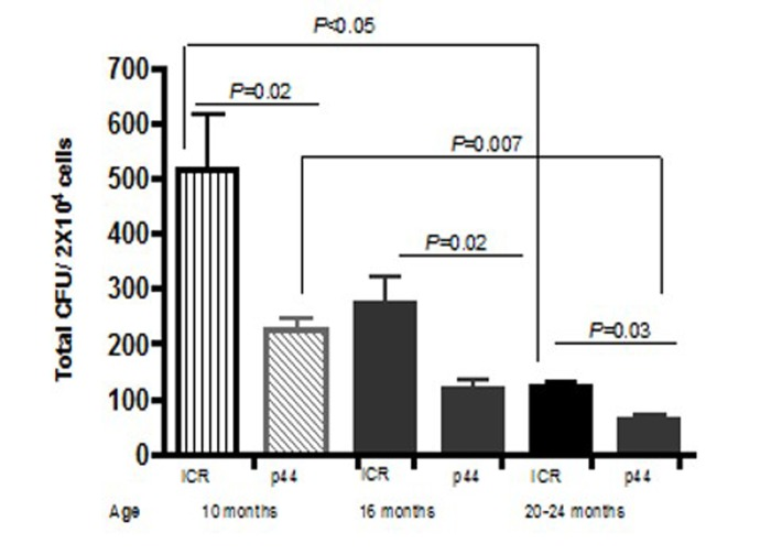 Based upon the above data demonstrating that recipients of old wild-type BM exhibit a significant reduction in survival as compared to recipients of young BM, we set up the following five experimental groups: six- to eight-week old female ICR recipient mice were lethally irradiated and transplanted with 1–2 × 106 BMCs isolated from the following donors: 1) young (4-week-old) male p44 transgenic mice; 2) young male ICR mice; 3) old (11-month-old) male p44 transgenic mice; 4) 11 month old male ICR mice; and 5) un-transplanted females as controls. The numbers of animals used in each group were based upon the same statistical rationale as was used in the p53+/m experiments. As shown in Figure 6, BM from 4 week old wild type donors gave better short term survival (92%; 23/25) than recipients of 11 month old wild type BM 78%; 18/23). BM from p44 donors at both ages was less able to support short term survival than BM from wild-type donors: 4-week old donors (80%; 20/25) and BM from 11-month old p44 donors exhibiting poorest four-week survival (61%; 14/25). To determine whether these differences were due to p44 or age associated defects, we examined the number of total colony forming units (CFU) in BM isolated from ICR and p44 mice at 10, 16, and 20–24 months of age. As shown in Figure 7, BM from p44 mice had fewer CFU than BM from age-matched ICR controls. In addition, the number of CFU in BM of wild-type mice decreased significantly with aging (compare 10 months to 20–24 months; p<0.05). Taken together, these results indicate that both aging and p44 reduce the function and/or number of ST-HSCs.