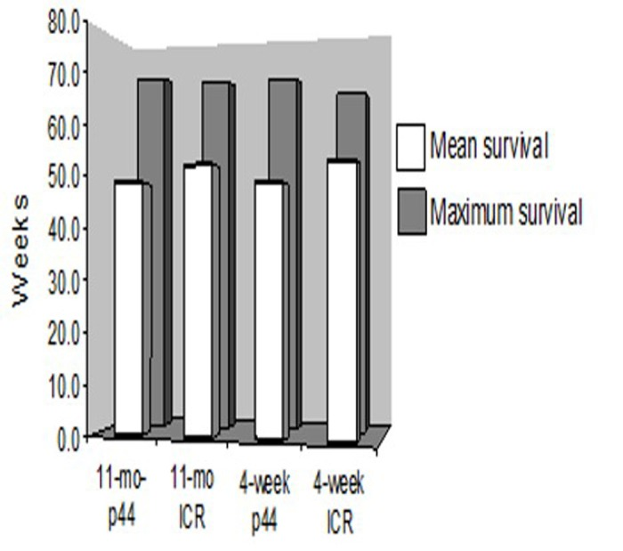 Long-term survival was monitored in those mice that engrafted i.e. survived post-irradiation and transplantation for more than 4 weeks. Examination of the Kaplan-Meier survival curve demonstrated that the death rates among groups are almost identical after 50 weeks (Figure 8). Mean and maximum survival rates across all transplanted groups were 50 and 70 weeks, respectively (Figure 9). However, a post-exploratory analysis of survival through 40 weeks (Figure 10) demonstrates that recipients of BM from p44 donors (4-week and 11-month) had a significantly reduced mid-life survival as compared to the un-transplanted controls. In addition to defects in engraftment and CFU, transplantation of BM from old p44 mice also results in deficiencies that are manifested between 30 and 40 weeks of age (mid-life).