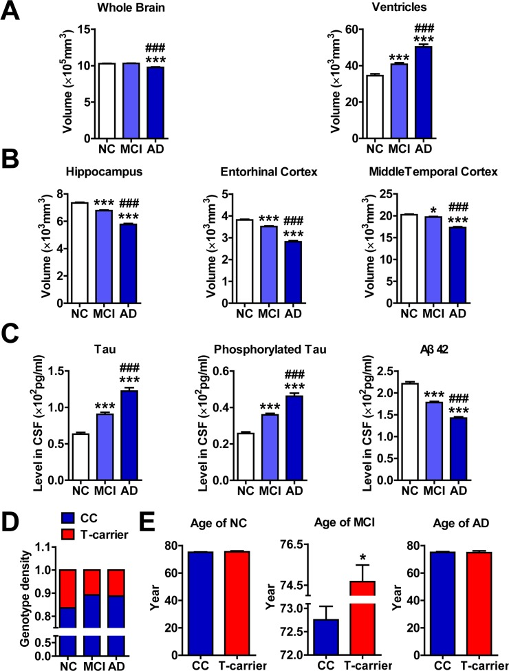 Our ADNI data analysis was consistent with previous studies [21] in that the whole brains of subjects with MCI and AD are progressively atrophic and the ventricles are enlarged (Figure 1A). Additionally, the hippocampi, entorhinal cortices and middle temporal cortices are increasingly atrophic (Figure 1B). Furthermore, the levels of Tau and phosphorylated Tau in the CSF are increased, whereas the levels of Aβ 42 are decreased (Figure 1C).
