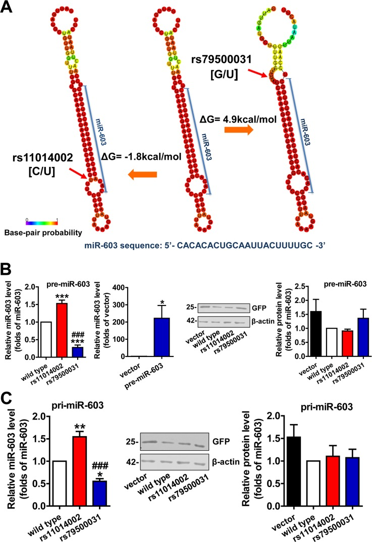 The enhancement of the stability of the hairpin structure, which is caused by a SNP in a pre-miRNA stem, is believed to increase the production of mature miRNA. Changes in Gibbs free energy (ΔG) can be used to qualify and quantify this process; typically, a negative ΔG is indicative of a more stable structural change and of a higher number of energy changes, to the extent that production is affected [23]. RNAfold analysis of the rs11014002 SNP indicated an alteration that is likely to enhance the stability of the hairpin structure, namely, the substitution of the C allele with a U allele reduces the size of the ring structure. Furthermore, an accompanying ΔG of −1.8 kcal/mol also suggested that the rs11014002 SNP might promote the biogenesis of mature miR-603 (Figure 2A left). Searching miRNASNP, we noted another SNP, rs79500031 in pre-miR-603; in this case, the substitution of the G allele with a U allele produces an asymmetrical ring structure, and the ΔG is 4.9 kcal/mal (Figure 2A right). Similarly, this attenuation of the stability of the hairpin structure appeared to diminish the expression of mature miR-603.
