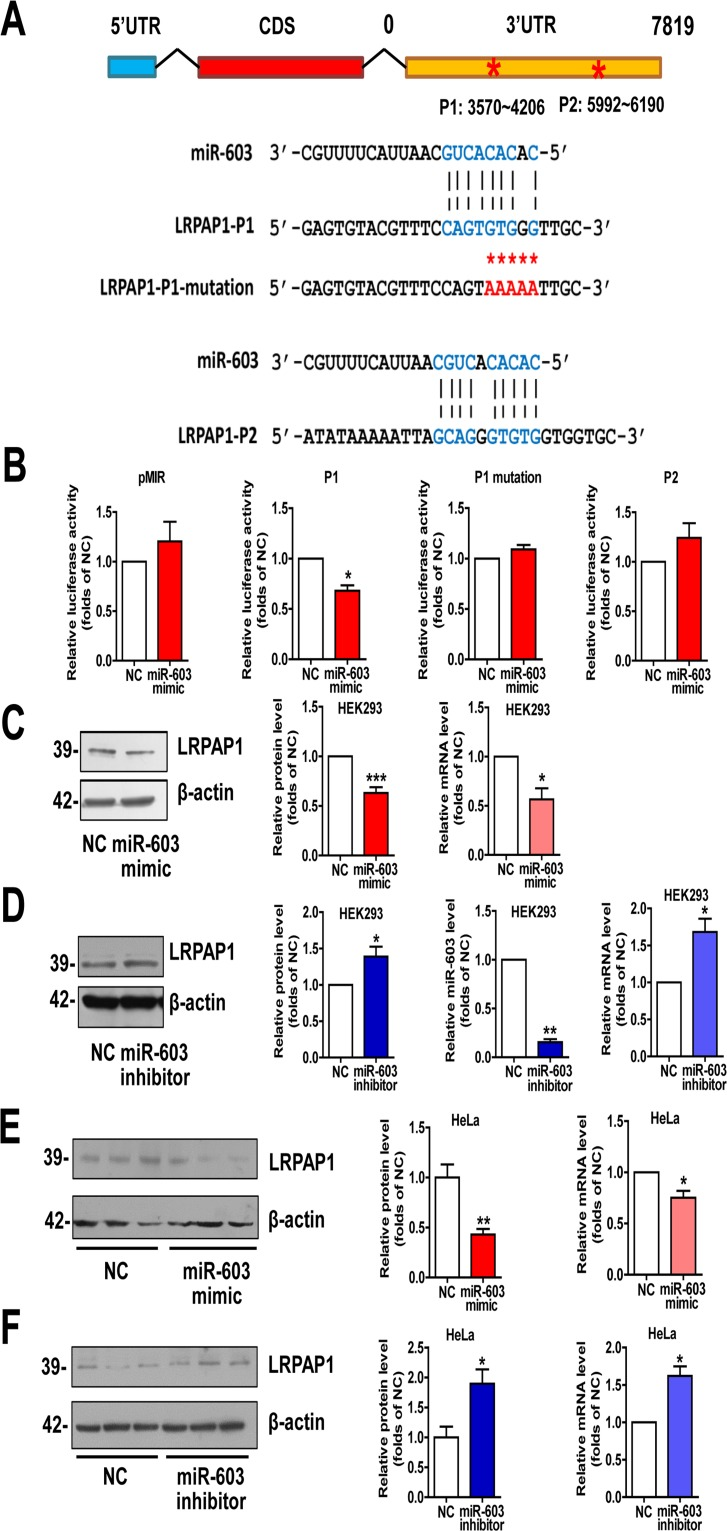 miR-603 directly targets LRPAP1 by binding the 3′ untranslated regions (3′UTRs) of LRPAP1 and downregulates LRPAP1 mRNA and protein levels