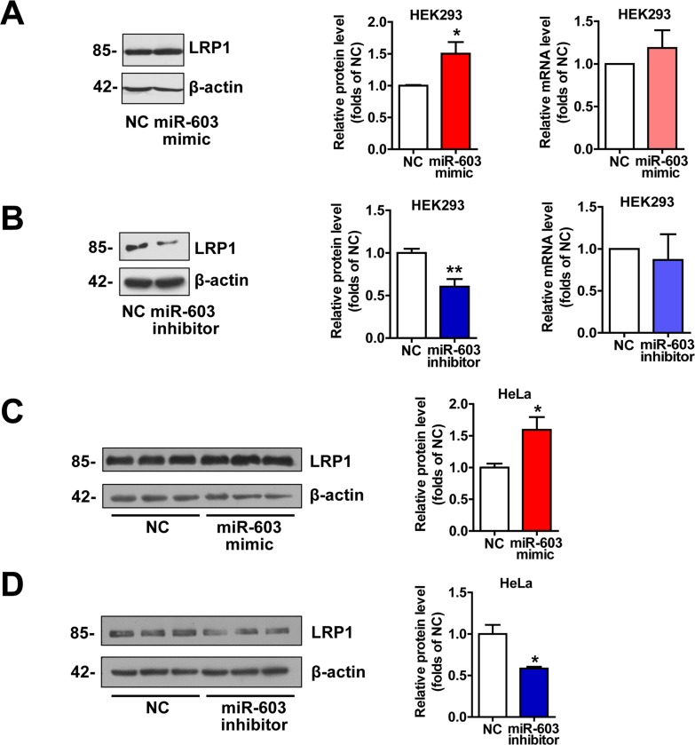 miR-603 increases the LRP1 protein levels but not mRNA levels