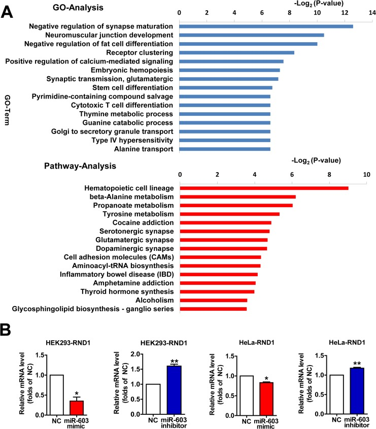 Profiles of differentially expressed genes (DEGs) targeted by miR-603 as determined by Gene Ontology (GO) and pathway analysis