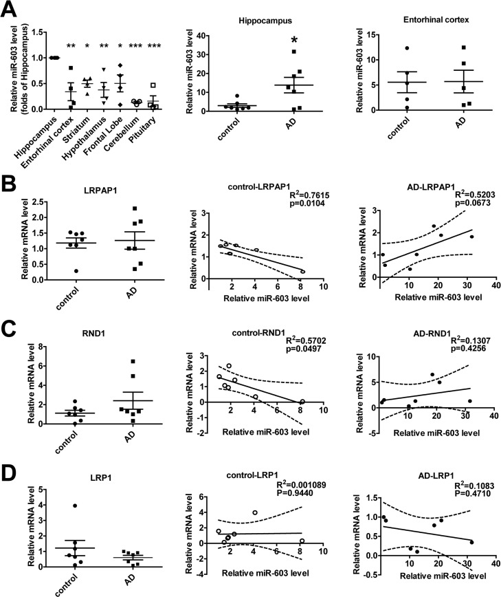 Statistical analyses. The data in the figures represent the mean ± SEM. Comparisons between two groups were performed using Student's unpaired or paired 2-tailed t-tests depending on the manner in which the experiments were conducted. Comparisons among three or more groups were performed using one-way ANOVA analyses followed by Bonferroni's multiple comparison test or a Dunnett multiple comparison test depending on the manner in which the experiments were conducted. Linear regression was used to examine the relationships between miR-603 expression and LRPAP1, RND1, LRP1 mRNA levels in control and AD groups. The data marked with asterisks in the figures significantly differ from the controls as follows: *P < 0.05, **P < 0.01, ***P <0.001.