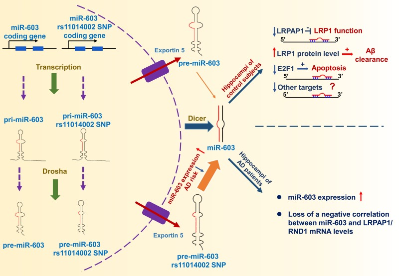 Through ADNI data analysis, we found that the rs11014002 SNP carriers exhibit reduced risk of AD and the rs11014002 SNP may serve as a protective factor against AD. Additionally, the rs11014002 SNP could promote miR-603 biogenesis. Moreover, we demonstrated that miR-603 directly targets LRPAP1 and upregulates LRP1 protein levels. Intriguingly, we found that miR-603 exhibits a relatively higher expression and there is a loss of a negative correlation between miR-603 and LRPAP1/RND1 mRNA levels in the hippocampi of patients with AD. Furthermore, miR-603 can prevent HeLa cells from undergoing H2O2-induced apoptosis possibly through targeting E2F1. Based on the above results, we proposed a working model that depicts the functional significance of miR-603 regarding AD pathogenesis and risk (Figure 8).