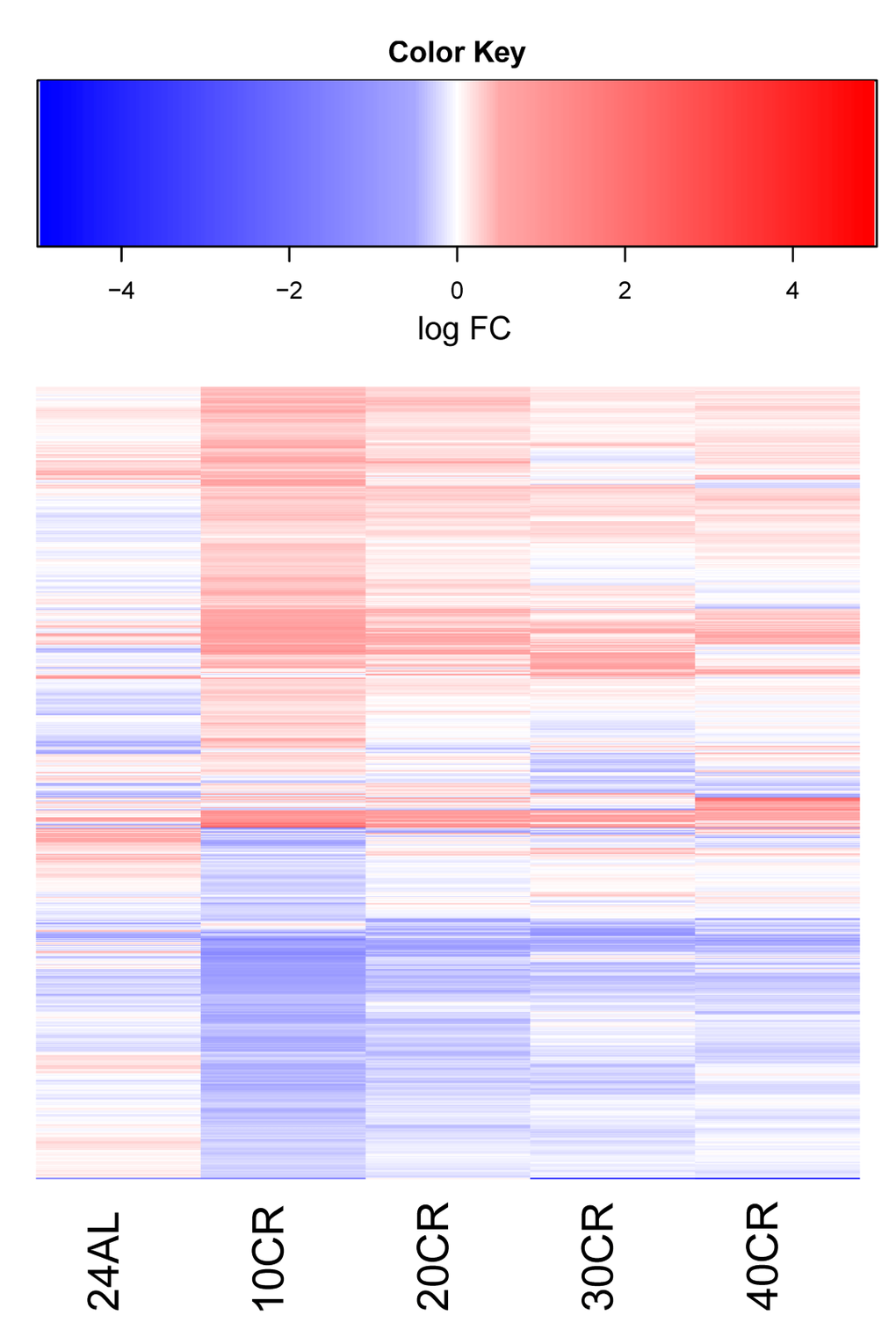 One animal (20 % CR group) was excluded from further analysis based on having > 20 % multi-mapped reads when aligned to the reference transcriptome, suggesting a problem with the sequencing technology. This mouse did not show an abnormal response in other aspects of its phenotype.