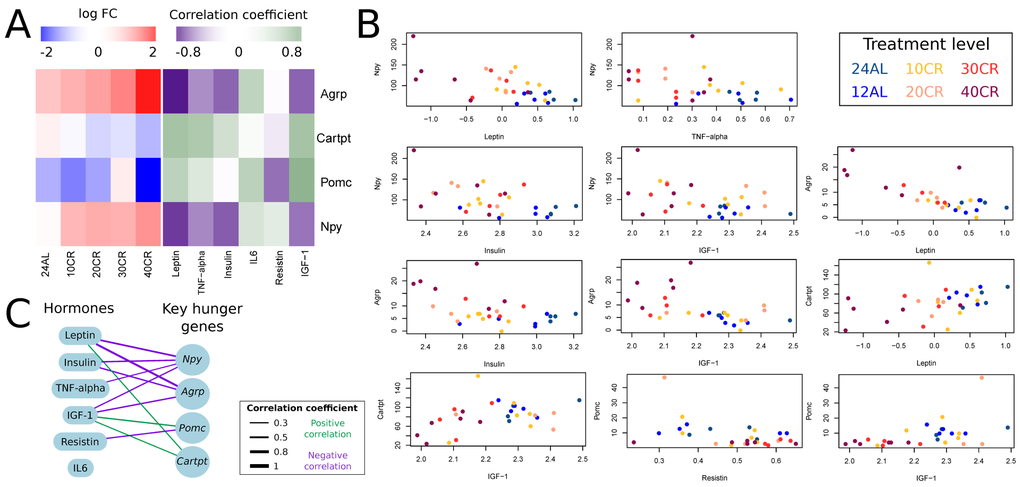 We explored the response of key hunger genes (Npy, Agrp, Cartpt and Pomc) to graded CR and how these genes correlated (Pearson correlation) with circulating hormone levels (hormone data from [36]). The expression of genes Npy and Agrp increased relative to CR level; and expression of Cartpt and Pomc decreased relative to CR level (Fig 3A). Npy was significantly upregulated at 10CR, 20CR, 30CR and at 40CR. Agrp was significantly upregulated at 30CR and 40CR. Pomc and Cartpt were significantly downregulated at 40CR (Table 1). Expression levels of Agrp correlated negatively with leptin, insulin and IGF-1. Cartpt correlated positively with leptin and IGF-1. Pomc correlated negatively with resistin and positively with IGF-1. Lastly Npy correlated negatively with leptin, TNF-α, insulin and IGF-1 (Fig 3B and 3C) (Table 2).