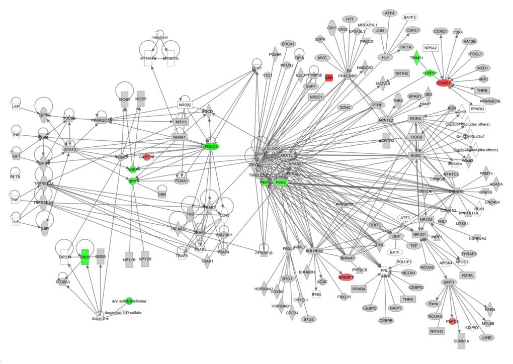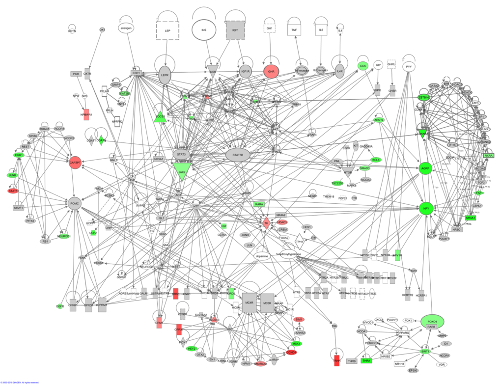 Circulating hormone levels (methods and data described in [36]) were correlated with each gene and each individual using Pearson correlations conducted in the statistical environment R (version 3.1.2) [121]. These correlations were used in IPA to map onto the hunger signaling pathway and circadian rhythm pathway. The hunger signaling and circadian rhythm pathways were constructed in the IPA program, which uses literature and expert knowledge-based approaches.