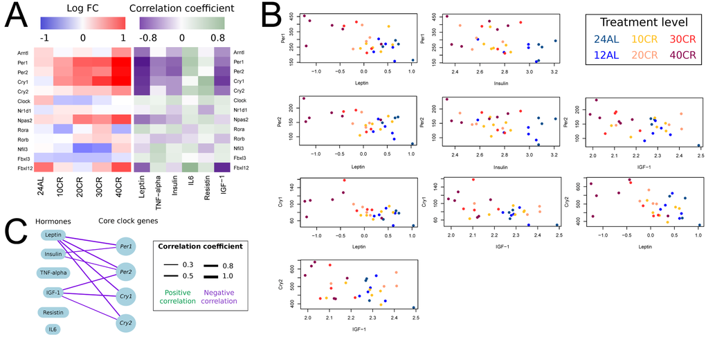 Food seeking behavior and temperature regulation are under circadian control [24], which is established centrally by the suprachiasmatic nucleus (SCN) located in the hypothalamus [25]. Circadian regulation is linked to metabolic homeostasis, and dysregulation can lead to metabolic diseases [26]. The interaction between circadian rhythms and metabolism is complicated, and many signals contribute to this regulation. Food intake has been found to influence circadian rhythms [26], and SCN cells have insulin, leptin and other hormone receptors [27,28]. Insulin in particular is thought to play an important role as a signaling hormone linking metabolism and circadian rhythms [29,30]. Furthermore circadian rhythms are influenced by age [31]. Older mice lose the ability to synchronize as well with the environment, although the circadian rhythms remain [32]. Desynchronization of circadian rhythms has a negative effect on longevity [33] and CR synchronizes these rhythms in the SCN [24]. This suggests CR might protect against age-associated loss of circadian rhythm synchronization [34]. Therefore, we expected that the response to CR would be to alter the expression of core clock genes, with circulating hormones playing a central role in this modulation.