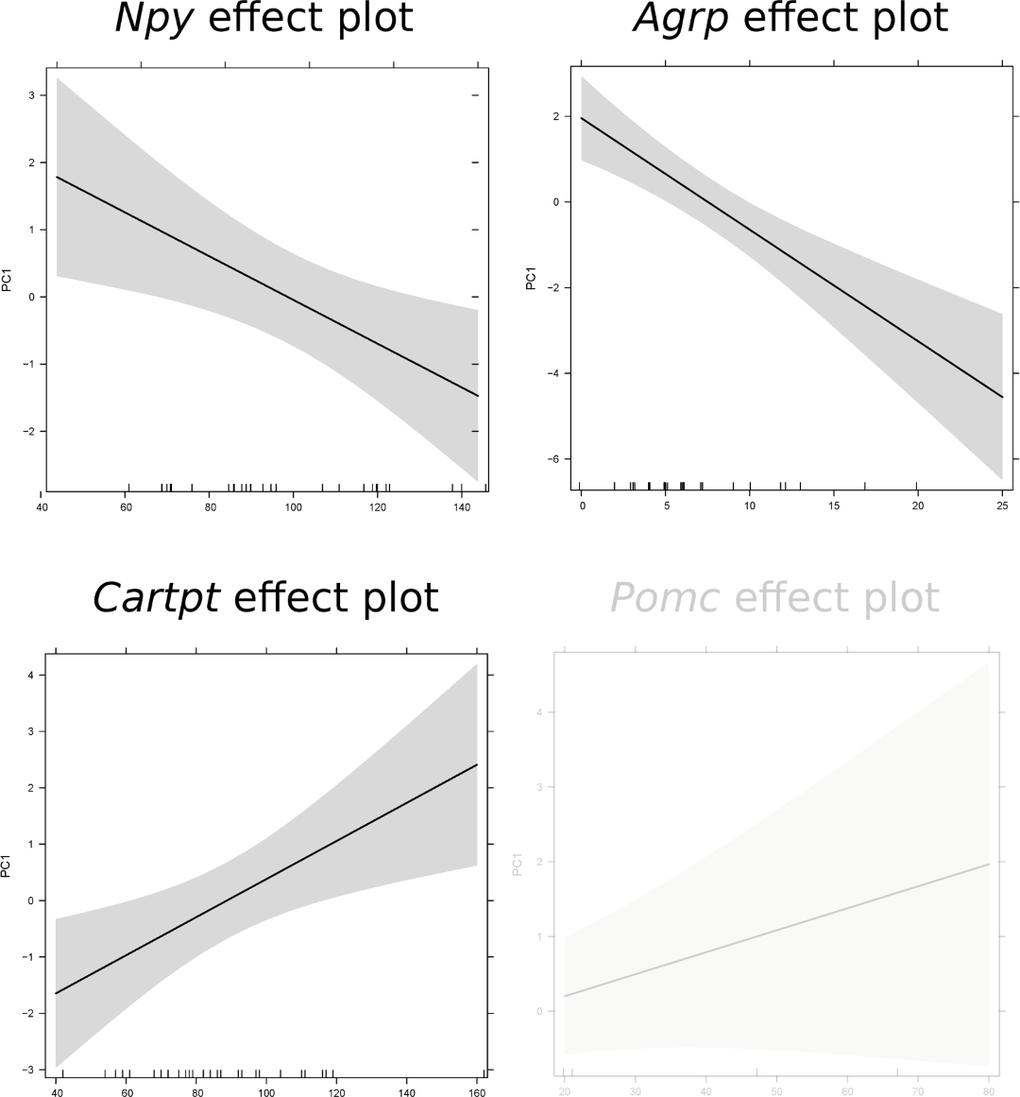 We previously established that these mice exhibit two phenotypic responses (modulated physical activity patterns [23] and reduced body temperature [22]) to CR throughout the CR study, which can be described as three states [23]: state I : active state with high activity and slightly higher body temperature relative to 12AL; state II: inactive state with low activity and slightly lower body temperature relative to 12AL; and state III: deeply inactive state with even less activity and a large drop in body temperature with occurrence of torpor [23]. We observed a phenotypic shift which involved a decline in the characteristics of these states (decline in body temperature and an economy of movements [23]). We therefore investigated whether the phenotypes described by these states could be associated with the expression level of hunger genes and core clock genes. We initially explored the phenotypic response profile of different groups by applying principal component analysis (PCA). The first two principal components explained ∼80% of the variance and individuals clustered according to CR level. This indicated that CR explained a majority of the variability observed in the phenotypic responses (Fig S11). Movement of state I (the most active state) seemed to drive the separation of 40CR, 30CR and 20CR individuals and AL groups. We further elaborated on the observed separation by analysing if phenotypic responses were associated with a single gene expression or a combination of genes. None of the variance observed in PC2 was significantly explained by gene expression level but variance in PC1 was. A significant proportion of the variance in behavioral responses could be explained by expression levels of 3 of the 4 key hunger genes, with the exception being Pomc (linear model (lm) PC1: F(1,31) = 2.272, pvalue = 0.141): Npy (F(1,31) = 7.501, p-value = 0.010), Agrp (F(1,31) = 25.26, p-value < 0.001) and Cartpt (F(1,31) = 6.101, p-value = 0.019) (Fig 7). Phenotypic responses were also significantly explained by the combined expression of these key genes (F(4,28) = 8.385, p-value < 0.001).