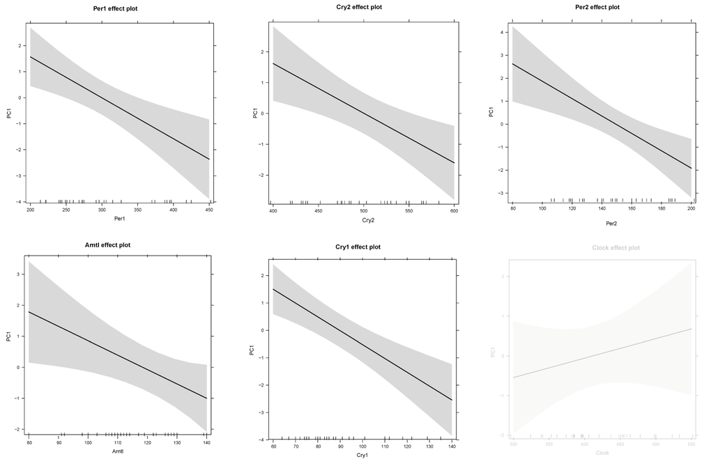 Similar results were found for the 5 core clock genes (lm PC1: F(6,26) = 4.436, p-value < 0.001) and phenotypic responses were significant associated with Per1 (F(1,31) = 12.67, p-value = 0.001), Per2 (F(1,31) = 11.47, p-value = 0.002), Cry1 (F(1,31) = 19.36, p-value < 0.001), Cry2 (F(1,31) = 9.751, p-value = 0.004) and Arntl (F(1,31) = 11, p-value = 0.002) but not on Clock (F(1,31) = 0.139, p-value = 0.712) expression levels (Fig 8).