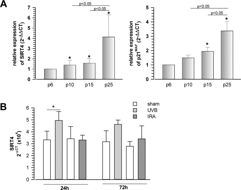 In the present study, we addressed a possible role of mtSIRTs in aging by analyzing their expression during cellular senescence and tissue aging. Initially, we observed that SIRT4 mRNA levels were upregulated at later passages during replicative senescence of human foreskin fibroblasts, comparable to the parallel increase in expression of the p53-induced cell cycle inhibitor and senescence effector p21WAF (Fig. 1A). The increase in SIRT4 mRNA levels was not specific to replicative senescence, as SIRT4 transcripts were found at elevated levels in primary human dermal fibroblasts, in which senescence was induced extrinsically by repetitive exposure to low, sublethal doses of ultraviolet radiation (UV) B radiation [38, 39] (Fig. 1B).