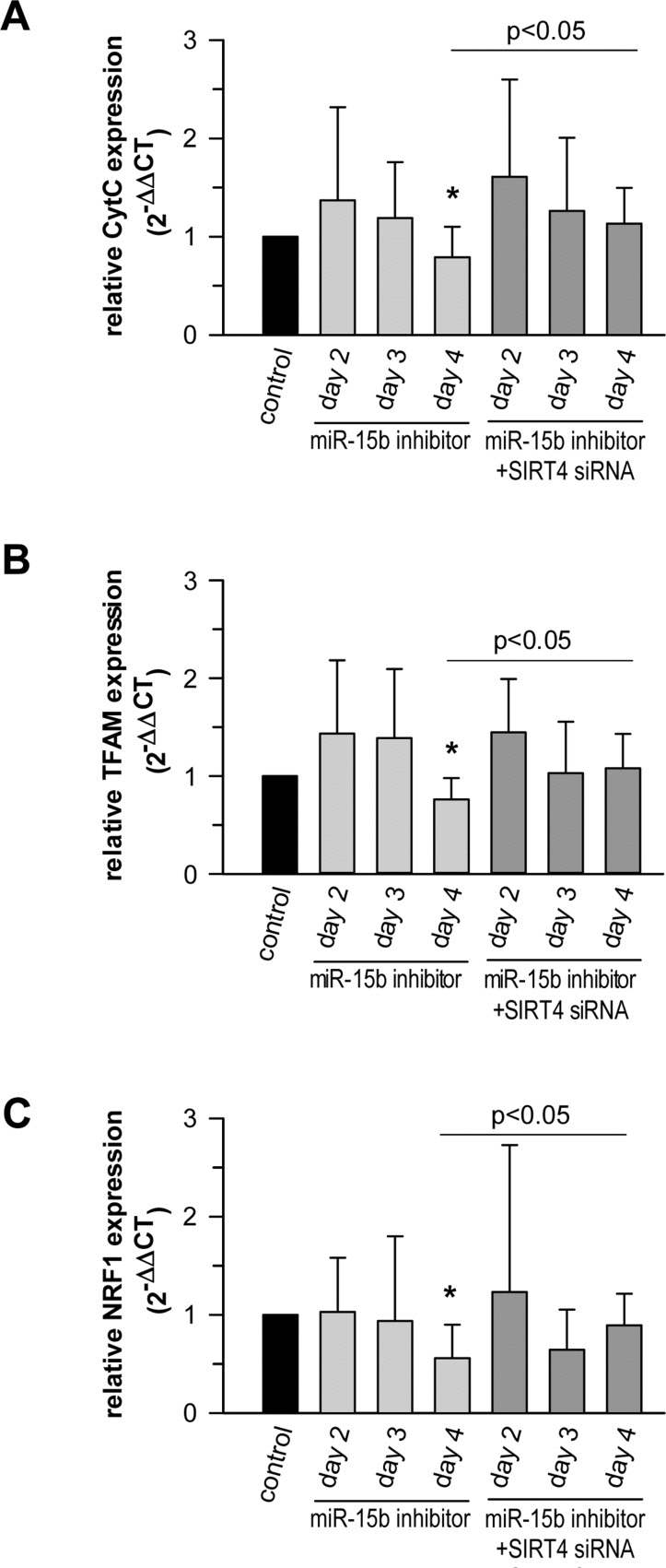 It has been reported that overexpression of SIRT4 elicits an AMPK-dependent “retrograde” signaling response from mitochondria to the nucleus thereby inhibiting expression of nuclear encoded key genes involved in mitochondrial biogenesis [79]. We therefore tested the impact of the miR-15b – SIRT4 axis on the expression of cytochrome C (CytC), a major component of the respiratory chain, as well as TFAM (TFAM, transcription factor A, mitochondrial) and NRF1 (NRF1, nuclear respiratory factor 1), which are both critically involved in mitochondrial gene expression [89, 90] and the antioxidant response [91]. Primary human dermal fibroblasts transfected with miR-15b inhibitors displayed a significant SIRT4 increase as early as three days after transfection (Fig. 7). Interestingly, under these conditions transcript levels of CytC, TFAM, and NRF1 were significantly reduced by approximately 21 to 44% by day 4 (Fig. 10A-C). The decrease in transcript levels could be prevented when miR-15b inhibitors were co-transfected with siRNA duplexes against SIRT4 showing that it is SIRT4 dependent (Fig. 10A-C). Thus, consistent with the findings of Ho et al. [79], increased SIRT4 expression may antagonize the expression of important nuclear encoded mitochondrial proteins. These results further support the concept of a causal relationship between the miR-15b – SIRT4 axis and ROS generation / mitochondrial dysfunction.