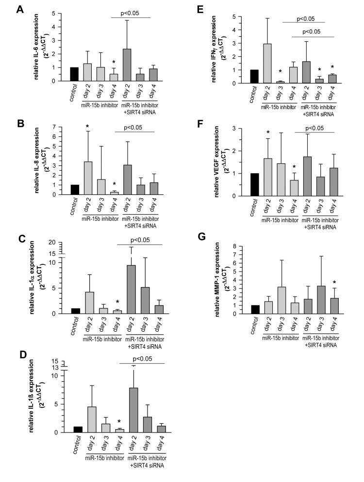 Senescent cells produce and secrete various autocrine- or paracrine-acting factors, including pro-inflammatory (e.g. IL-6) and pro-migratory (e.g. IL-8) cytokines, growth factors (e.g. VEGF), and proteases like matrix metalloproteinase-1 (MMP-1), collectively known as the SASP [14, 15, 17, 92-94]. MicroRNAs play an important role in SASP regulation and e.g. prevent an overproduction of inflammatory cytokines and therefore persistent inflammatory responses [17]. This is e.g. illustrated by the senescence associated up-regulation of miR-146b (suppl. Table 1) which serves to tune down the expression of Interleukin-6 (IL-6) and Interleukin-8 (IL-8) via downregulating IRAK1 expression and thus NFκB activity [46]. We therefore tested whether the miR-15b – SIRT4 axis is of functional relevance for the expression of well-known components of the SASP in primary human dermal fibroblasts. Interestingly, miR-15b inhibitors displayed a biphasic impact on the expression of VEGF and the cytokines analysed. We observed an increased expression at day 2 upon transfection of miR-15b inhibitors followed by a clear decrease of transcript levels (31-80%) at day 3 (IFNγ) and day 4 (IL-1α, IL-1β, IL-6, IL-8, and VEGF) (Fig. 11A-F). The latter decrease was SIRT4 dependent as the expression of all factors was ameliorated when miR-15b inhibitors were co-transfected with siRNA duplexes against SIRT4 (Fig. 11A-F). Of note, the initial rise in cytokine transcript levels upon miR-15b inhibition could be potentially due to increased IRAK2-NFκB signaling, given that IRAK2 represents a predicted target gene of miR-15b [95] (A. Lang and R. Piekorz, unpublished). Taken together, miR-15b may regulate the SASP, which is typically NFκB driven [96], at two levels, negatively via IRAK2, comparable with miR146-induced dampening of IL-6 and IL-8 expression via IRAK1 targeting [46], and positively via SIRT4 downregulation.