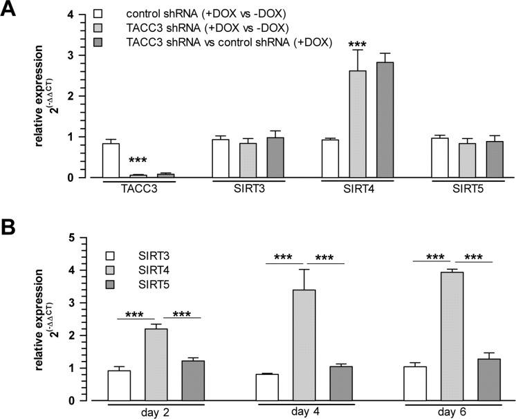 In order to assess the potential role of miRNAs in senescence-associated SIRT4 upregulation, we next performed a global, microarray-based comparison of corresponding miRNA- and mRNA expression profiles (both linked in suppl. Table 2) followed by relative miRNA quantification using qRT-PCR in our model systems. Our miRNA findings are based on an initial screen performed in MCF7 cells undergoing premature senescence upon TACC3 depletion (suppl. Table 1). We identified and verified a differential expression of various miRNAs, including members of the miR-17-92 and miR-106a-363 clusters, which became down-regulated upon cellular senescence (suppl. Table 1 and suppl. Fig. 3), consistent with the work of Hackl et al. [48]. Upregulated senescence-associated miRNAs included miR-146, which is linked to dampening of the SASP [46], and miR-125b, which is involved in the regulation of keratinocyte proliferation and differentiation [53]. In contrast, miR-22, a miRNA upregulated in human senescent fibroblasts targeting SIRT1 expression [54], was not identified as differentially expressed upon TACC3 depletion (suppl. Table 1), a finding consistent with insignificantly changed SIRT1 mRNA levels (suppl. Fig. 1).