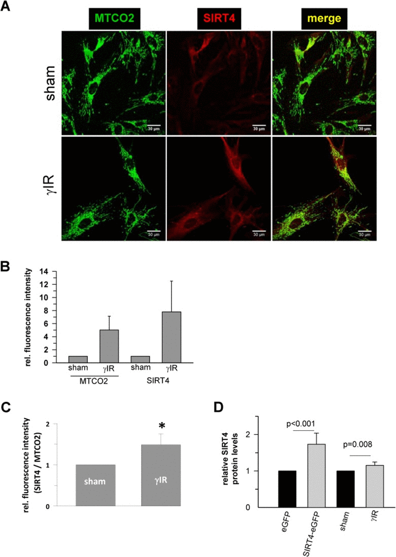 To test whether senescence-associated SIRT4 upregulation was cell-type specific, we next employed additional cellular models of premature senescence. We combined this analysis with gene array-based expression screens, which included all SIRT isoforms (suppl. Fig. 1), followed up by reassessment of the expression of mtSIRTs using quantitative real-time PCR (qRT-PCR) (Fig. 2). Interestingly, among the seven sirtuin family members, and in particular among the mtSIRTs SIRT3, SIRT4, and SIRT5, only SIRT4 was consistently and significantly upregulated in epithelial breast adenocarcinoma MCF7 cells undergoing stress-induced senescence. This result was observed regardless of whether senescence was triggered by mitotic spindle stress through depletion of the centrosomal protein TACC3 [22] or by treatment with gamma-irradiation (γIR) [40] (suppl. Fig. 1 and Fig. 2A,B). Additionally, we also subjected primary human dermal fibroblasts to γIR to trigger stress-induced senescence [41]. As indicated in Fig. 3 and suppl. Fig. 2 (as well as in Fig. 6A at the transcript level), γIR resulted in an increased protein levels of SIRT4, which colocalized with the mitochondrial marker MTCO2 (mitochondrially encoded cytochrome C oxidase II) as observed by confocal laser scanning microscopy. The relative fluorescence intensity of cellular SIRT4 signals (as normalized to MTCO2 signals) was significantly higher in γ-irradiated cells as compared to sham treated controls (Fig. 3C). ELISA-based quantification of total cell lysates revealed SIRT4 protein levels which were increased by approximately 20% in irradiated vs. non-irradiated cells (Fig. 3D). These findings show that cellular senescence, either of replicative or stress-induced nature, is accompanied in a cell type-independent manner by an increased SIRT4 expression in mitochondria.