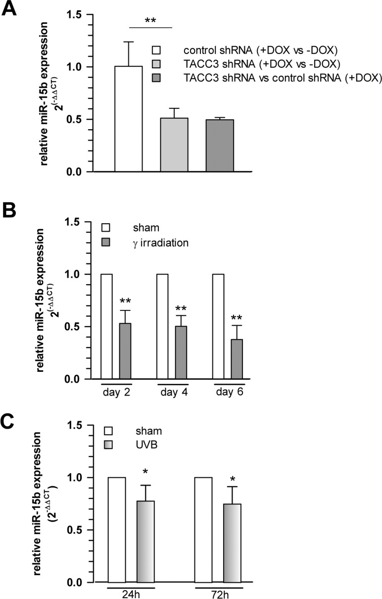 Interestingly, among the miRNAs analysed, we observed a robust and significant downregulation of miR-15b in TACC3 depleted or γ-irradiated senescent MCF7 cells (Fig. 4A,B), concomitant with a parallel upregulation of SIRT4 expression (Fig. 2), which represents a bona fide candidate target of miR-15b (suppl. Table 2 and suppl. Fig. 4). Similarly, and again in accordance with the SIRT4 expression status (Fig. 1B), miR-15b levels were also decreased in UV-irradiated or gamma-irradiated senescent primary human dermal fibroblasts (Fig. 4C and 6B). Lastly, consistent with our findings, up to fourfold decreased miR-15b levels were observed in various models of organismal aging as well as replicative cellular senescence [48, 49, 55, 56], the latter being in accordance with an increased SIRT4 expression in human fibroblasts undergoing replicative senescence (Fig. 1A).