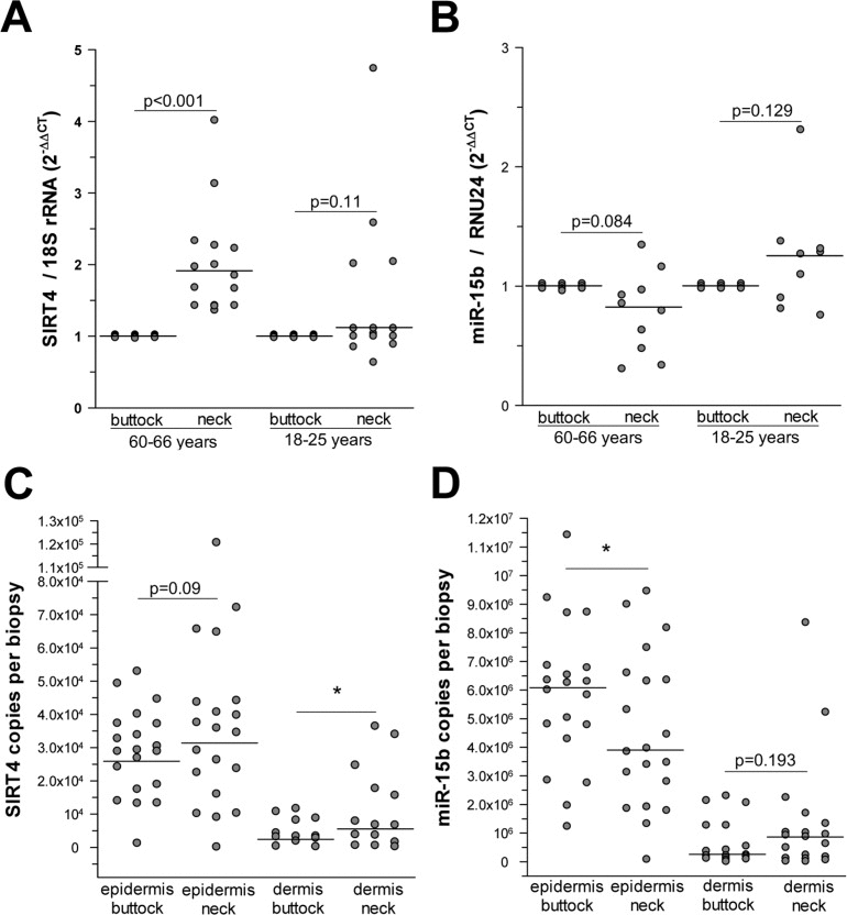 Quantification of copy numbers of mir15b and SIRT4 in the epidermis and dermis of human skin
