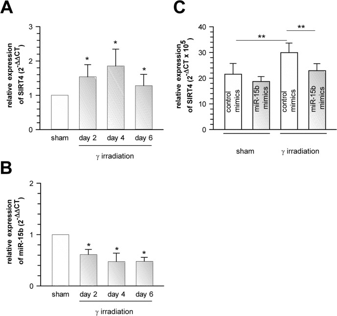 In the case of primary human dermal fibroblasts, cells were transfected with 50 nmoles of control mimics or miR-15b mimics using the DharmaFect transfection reagent essentially as described by the manufacturer (ThermoScientific). Cells were trypsinized twenty four hours after transfection, exposed to γIR (20 Gy) as described above, and thereafter re-seeded on 6-well plates at densities of 7.3×103/cm2 (controls) and 10.5×103/cm2 (γIR). SIRT4 mRNA levels were determined twenty four hours later by quantitative RT-PCR as described above.