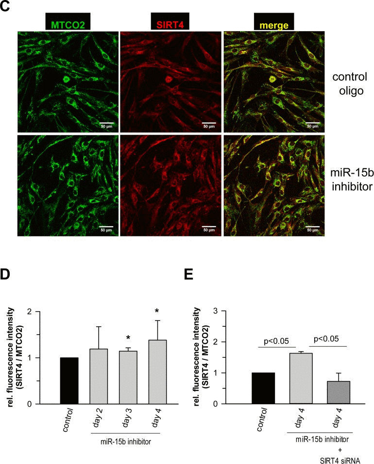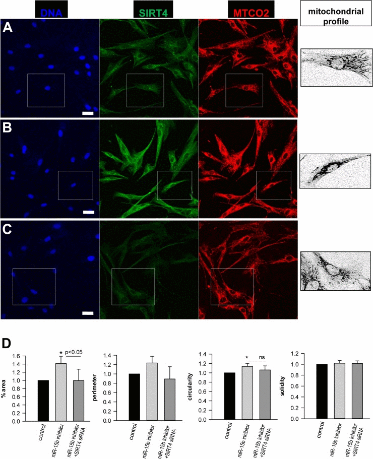 Human dermal fibroblasts were transfected with miR-15b inhibitors in the presence or absence of siRNA duplexes against SIRT4 as described above. Four days later, cells were fixed and stained with SIRT4 and MTCO2 specific antibodies. The mitochondrial network was analysed as described [103] employing an ImageJ Mito-Morphology macro (http://imagejdocu.tudor.lu/doku.php?id=plugin:morphology:mitochondrial_morphology_macro_plug-in:start) [104] to evaluate microscopic pictures taken by confocal laser scanning microscopy. Cellular morphology/size was defined by parallel α-Tubulin staining.