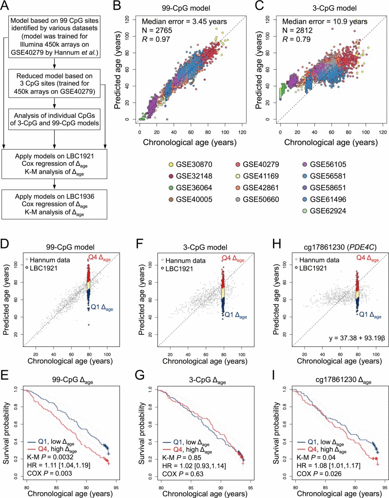 The 99-CpG model and the adjusted 3-CpG model were subsequently applied to DNAm profiles of the LBC1921 study [9,13]. These participants were born in 1921 and recruited and tested in older age between 1999 and 2001 (N = 446; ndeath = 328). The 99-CpG model and 3-CpG model revealed median error of 5.3 and 11.5 years, respectively (Table 1) – whereas it was 5.5 and 6.0 years using the age-predictors by Hannum et al. or Horvath [9]. In the 99-CpG model, a five-year higher age-prediction was associated with 11% greater mortality risk (95% confidence interval: [1.04, 1.19]; Cox regression P = 0.003) after adjustment for gender and chronological age. Kaplan-Meier (K-M) analysis of quartiles with highest and lowest Δage (P = 0.0032) further visualized and validated that epigenetic-age predictions are indicative for all-cause mortality (Figure 1D,E).