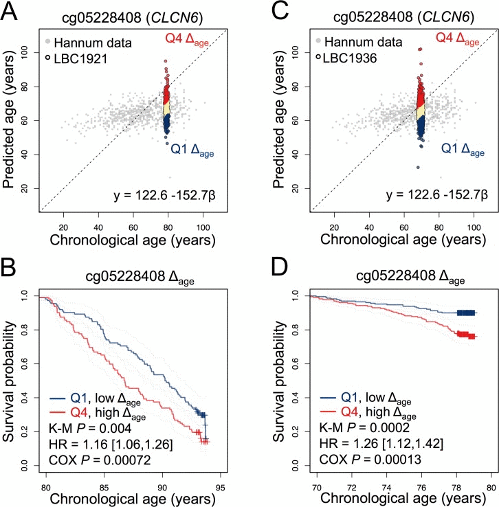 Subsequently, we tested for associations of single-CpG derived age-predictions with mortality: several CpGs revealed significant results in the LBC1936 data but there was only a moderate overlap with survival-associated CpGs in LBC1921 (Supplementary Tables 3-5). For example, the CpG site located in PDE4C (cg17861230) revealed a similar trend but the results were not significant (HR = 1.09 [0.98; 1.21]; Cox P = 0.12; Supplementary Figure 2). It might be expected that DNAm changes at these CpGs are not entirely linear over time and hence they may have different prognostic value in cohorts of different age.