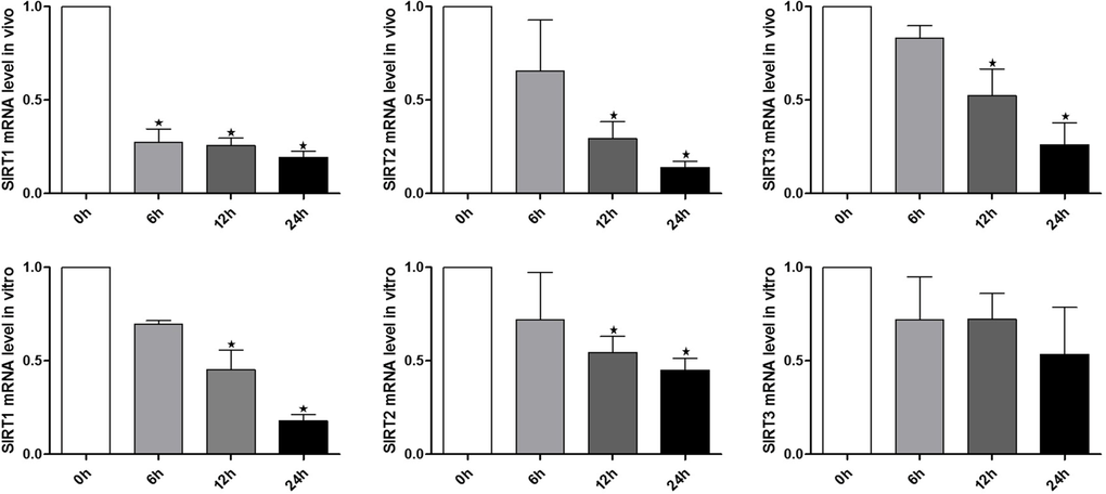 To explore the potential involvement of SIRT1, 2, 3 during the oocyte aging process, in vivo and vitro-aged oocytes were collected to analyze the mRNA expression. Notably, results from real-time RT-PCR revealed that SIRT1, 2, 3 mRNA levels significant decreased in MII oocytes aged in vivo or in vitro, when compared to fresh MII oocytes (Figure. 1). Oocytes showed a significant time-dependent decrease in SIRT1, 2, 3 mRNA levels, suggesting that SIRT1, 2, 3 may contribute to mouse postovulatory oocyte aging.