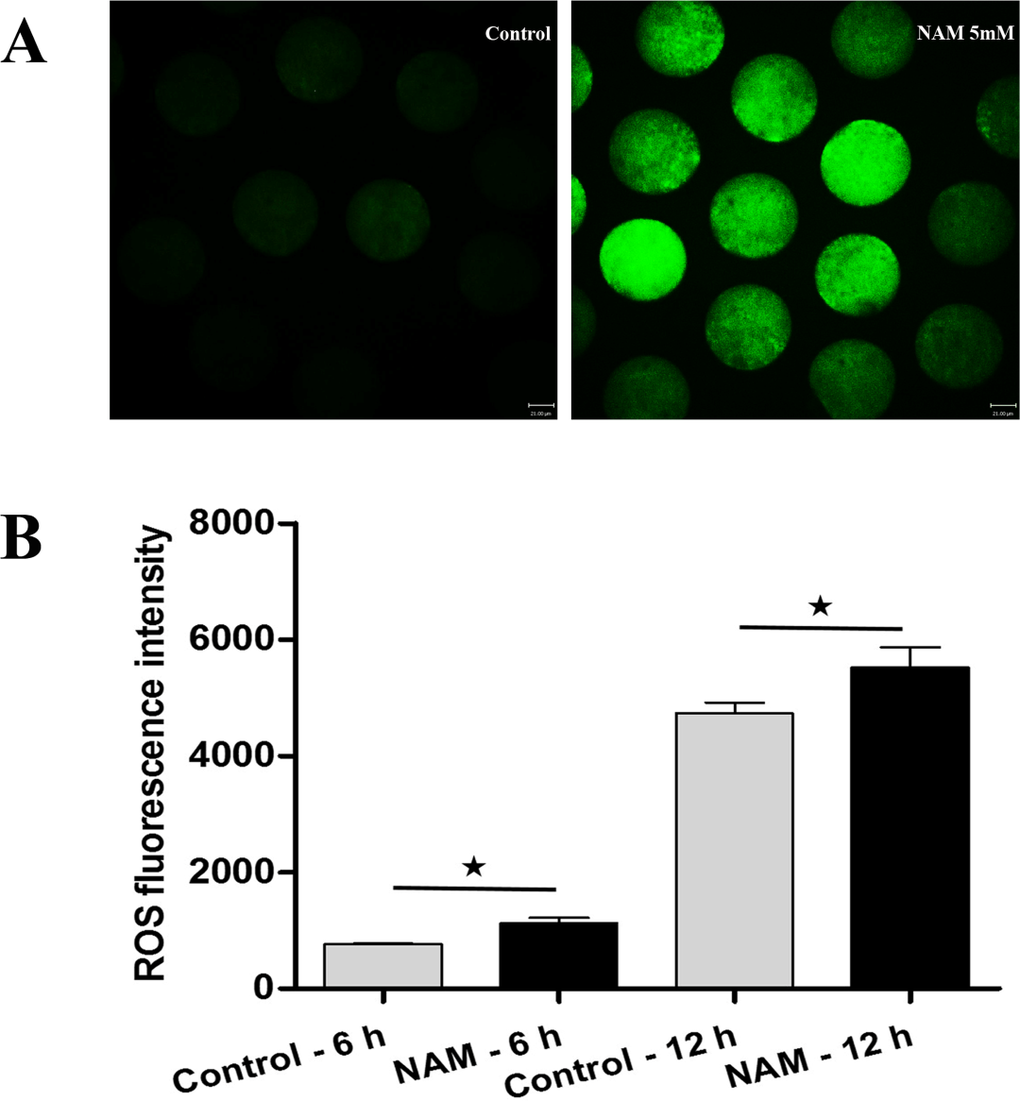 To investigate whether SIRT1, 2, 3 play a role in protection against oxidative stress, MII oocytes were exposed to Nicotinamide (NAM), a SIRT1, 2, 3 inhibitor. Firstly, ROS level was analyzed at 6 h of oocyte aging in vitro after 0, 1, 5, or 10 mM NAM treatment. When MII oocytes were exposed to 1 mM NAM, the ROS level was not significantly higher compared to untreated oocytes. However, the ROS level was significantly increased by 5 or 10 mM NAM treatment (Figure S1A). Due to the less severe disruption caused by 5 mM NAM, we used this concentration for all subsequent experiments. Subsequen-tly, ROS level was analyzed at 6 h or 12 h of oocyte aging in vitro. Oocytes analyzed at 12 h of aging showed increased ROS levels when compared to oocytes aged for 6 h. When MII oocytes were exposed to 5 mM NAM, the ROS levels observed at 6 h or 12 h were significantly higher compared to that in control untreated oocytes, indicating elevated ROS by SIRT inhibition (Figure 2).