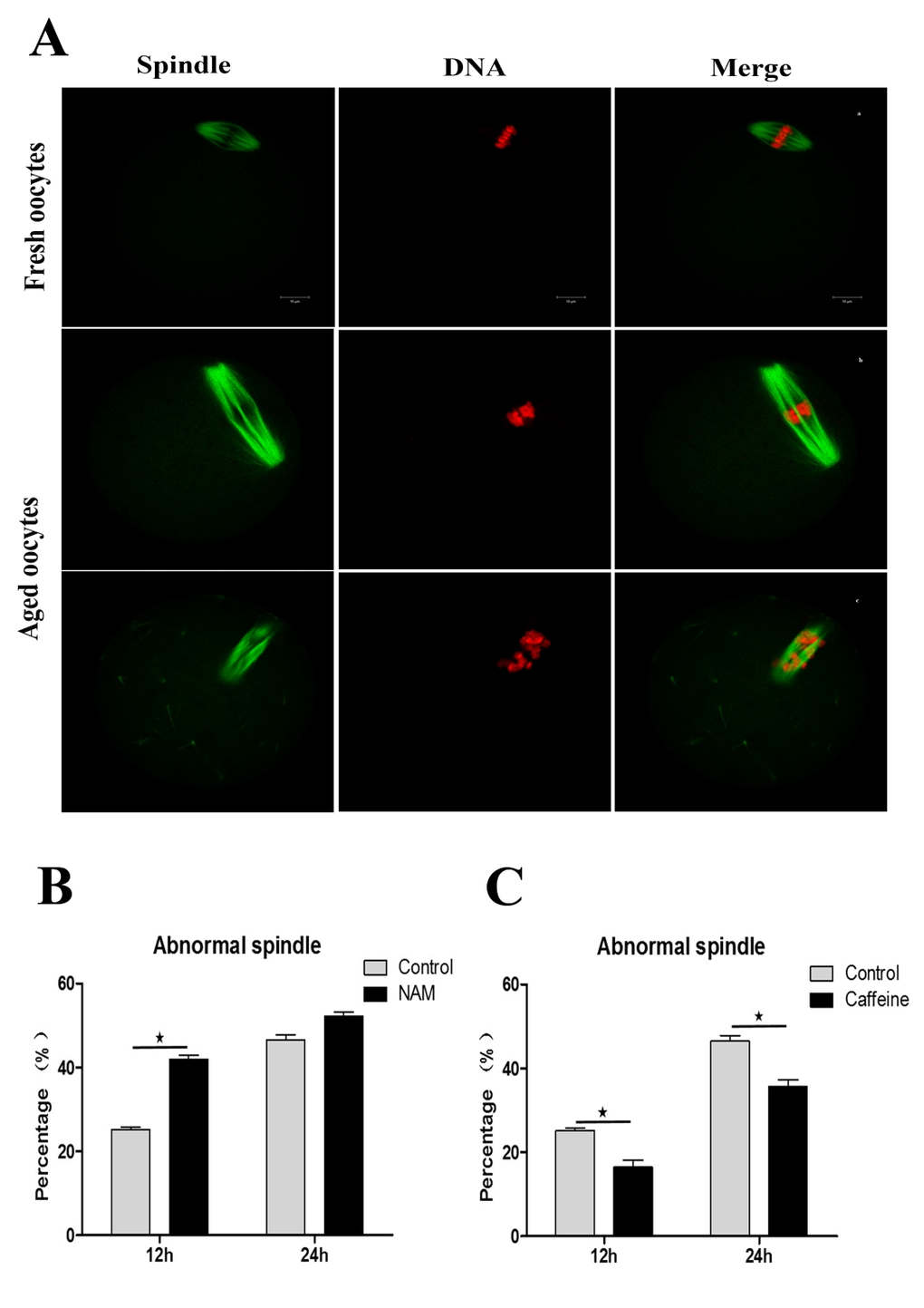 Firstly, we tested the spindle morphology in fresh, aged, and NAM-treated MII oocytes. As shown in Figure 3A, confocal microscopy revealed that fresh MII oocytes displayed a typical barrel-shaped spindle. However, in aged MII oocytes, spindles became elongated and microtubules became gradually lost from the spindle. Analysis of MII oocytes at 12 h of aging showed that the proportion of abnormal spindles was significantly higher in NAM group than in the control group (41.89 ± 1.66 vs. 25.10 ± 1.26%, P < 0.05). However, the rate of abnormal spindles observed at 24 h of aging showed no significant difference between the NAM group and the control untreated group (52.14 ± 1.88 vs. 46.47 ± 2.34%, P > 0.05).